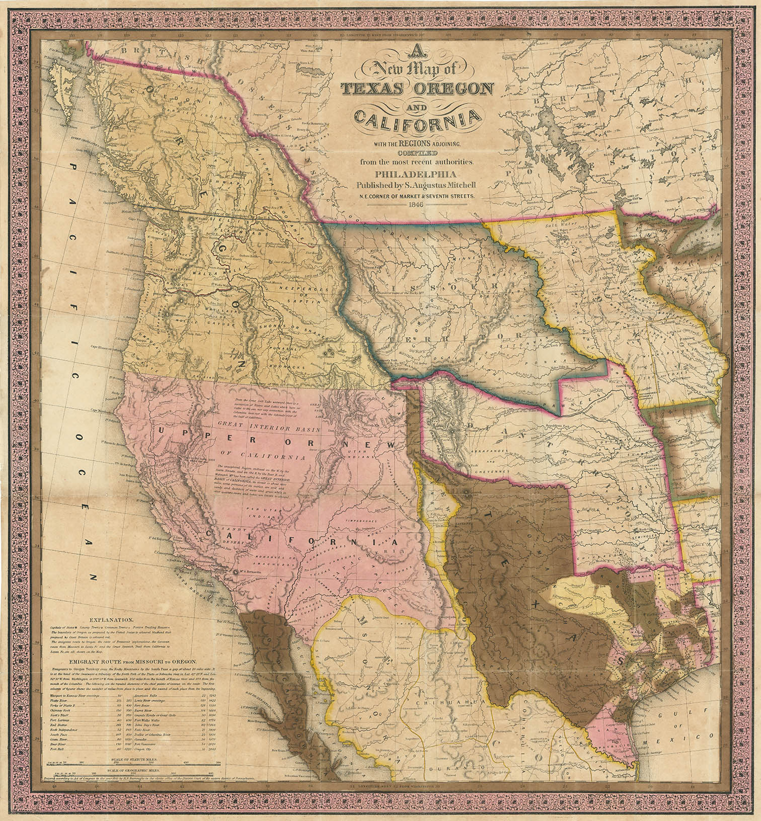 DESCRIPTION: One of the great pocket maps of the American West.<br><br> Wheat writes: "This map represents a great step forward, in that it was among the first by a commercial cartographer to utilize the recent explorations. . . ." <br><br> The newly formed state of Texas is shown with its "stove-pipe" configuration, claiming the lands of the upper Rio Grande. These claims were eventually given up as part of the Great Compromise of 1850, in exchange for the U.S. Federal Government's assumption of Texas' public debt.<br><br> Mitchell based this map on works of Arrowsmith, Nicollet, Wilkes and Fremont. The popularity of this map was likely enhanced by the Mexican-American War which commenced the year the map was issued.<br><br>