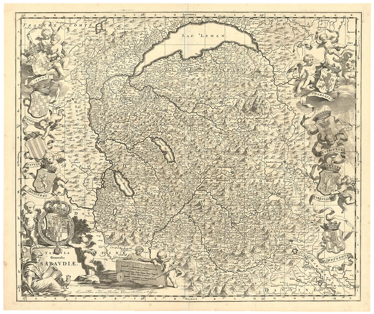 DESCRIPTION: A fine and beautifully engraved map of Italian Alps including Lake Leman, Switzerland. Richly detailed with pictorial relief of mountains and watersheds. Putti hold the coat of arms of the dukes of Savoy above the title cartouche in the lower left corner. Other family crests from the regional duchies and baronies ring the map.<br><br> This map was drawn by Giovanni Tommaso, Borgonio and engraved by Joannes de Broen,<br><br> This map appeared in Blaeu's townbook of Piemonte & Savoye, issued in 1682.