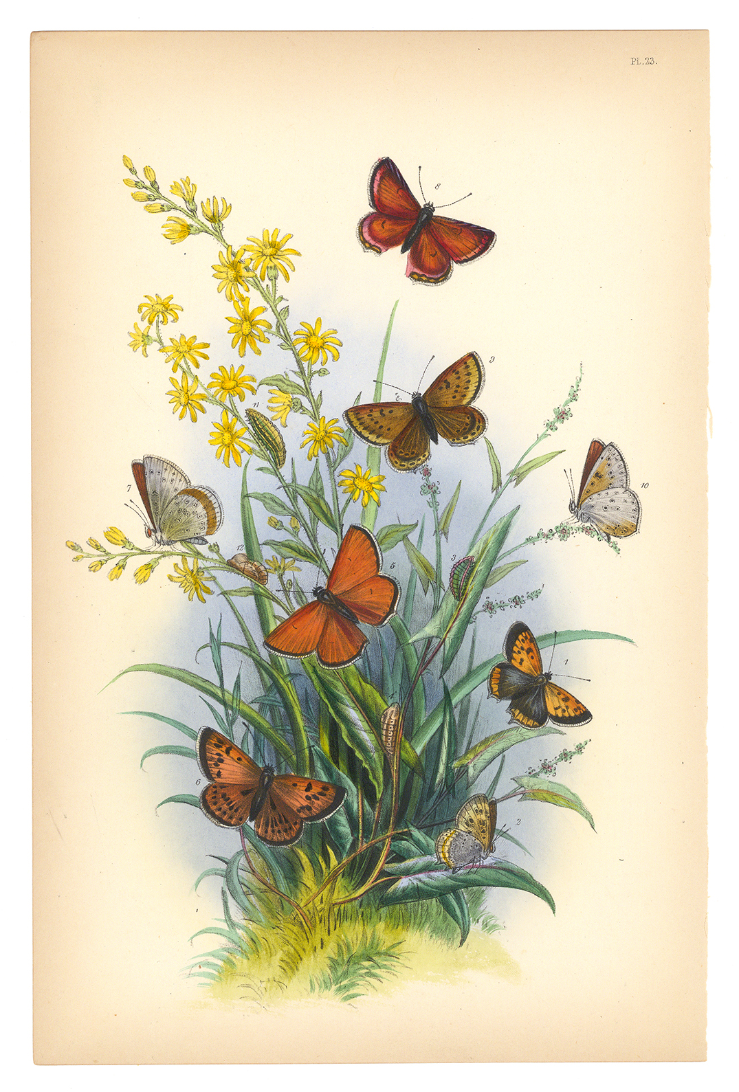 DESCRIPTION: Beautifully colored image of eight butterflies. The prints are not titled but the accompanying text gives their names, a brief description of their lifespans and habitats where they reside.<br><br> Species shown, The Copper Butterfly, The Dark Under-winged Copper Butterfly, female and showing the underside. The Purple-edged Copper Butterfly, the female and the showing the underside. The caterpillar and the chrysalis of the Copper Butterfly. The caterpillar and the chrysalis of the Scarce Copper Butterfly.<br><br> Henry Noel Humphreys, (1810-1879) was a British illustrator, naturalist, and numismatist, became an accomplished scholar in numerous subjects in the humanities and sciences.