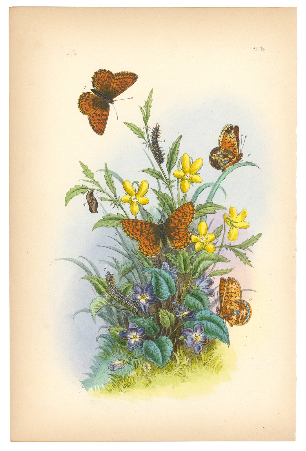 DESCRIPTION: Beautifully colored image of four butterflies. The prints are not titled but the accompanying text gives their names, a brief description of their lifespans and habitats where they reside.<br><br> Species shown, The Small Pearl-bordered Fritillary Butterfly, the underside, caterpillar and chrysalis. The Pearl-bordered Fritillary Butterfly, the underside, caterpillar and chrysalis.<br><br> Henry Noel Humphreys, (1810-1879) was a British illustrator, naturalist, and numismatist, became an accomplished scholar in numerous subjects in the humanities and sciences.