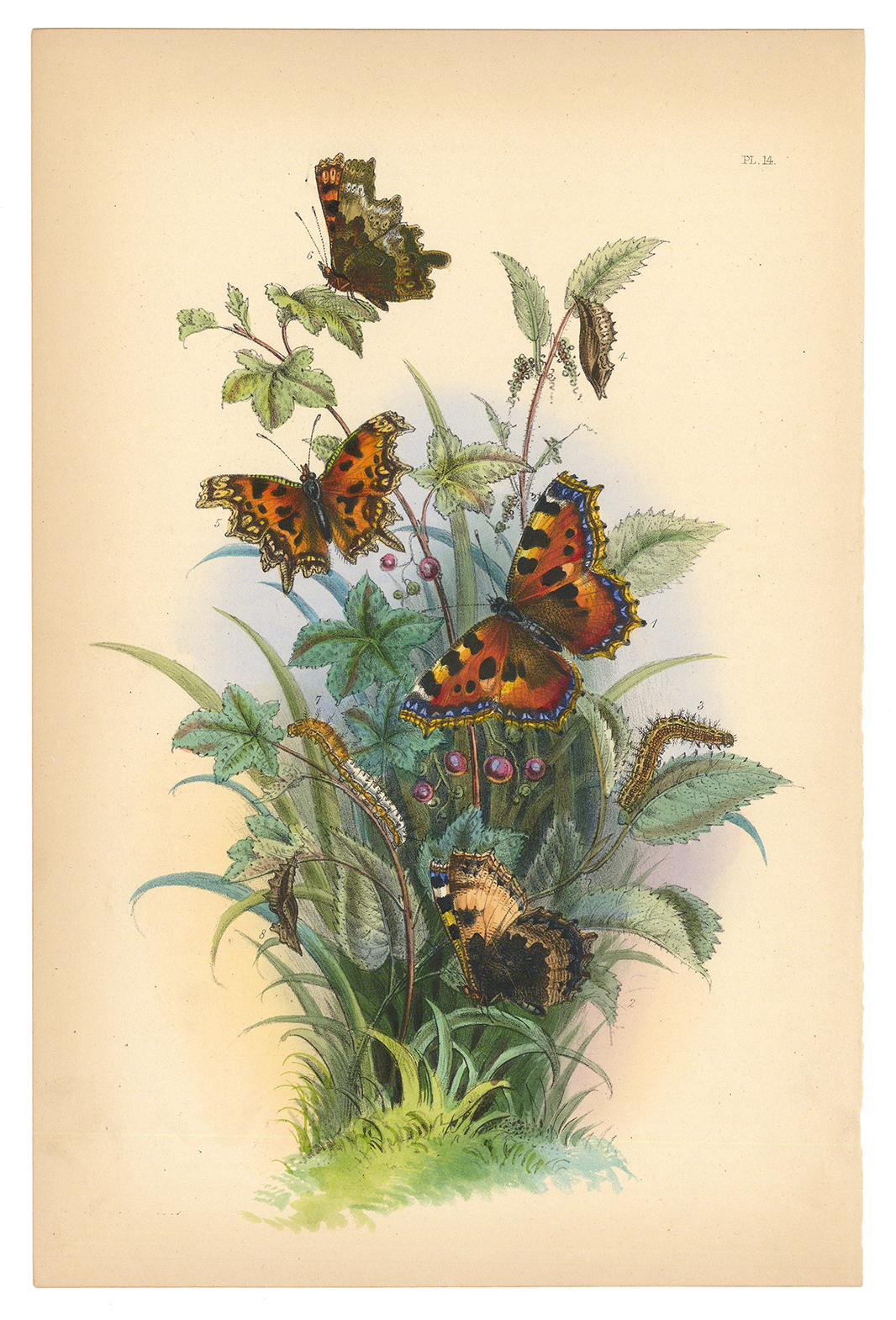 DESCRIPTION: Beautifully colored image of four butterflies. The prints are not titled but the accompanying text gives their names, a brief description of their lifespans and habitats where they reside.<br><br> Species shown, The Small Tortoise-shell Butterfly, the underside, caterpillar, and the chrysalis. The Comma Butterfly, the underside, caterpillar, and the chrysalis. <br><br> Henry Noel Humphreys, (1810-1879) was a British illustrator, naturalist, and numismatist, became an accomplished scholar in numerous subjects in the humanities and sciences.