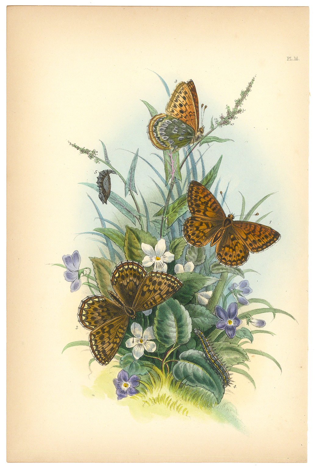 DESCRIPTION: Beautifully colored image of 3 butterflies. The prints are not titled but the accompanying text gives their names, a brief description of their lifespans and habitats where they reside.<br><br> Species shown, The Dark Green Fritillary Butterfly, the female, underside, caterpillar, and the chrysalis. <br><br> Henry Noel Humphreys, (1810-1879) was a British illustrator, naturalist, and numismatist, became an accomplished scholar in numerous subjects in the humanities and sciences.