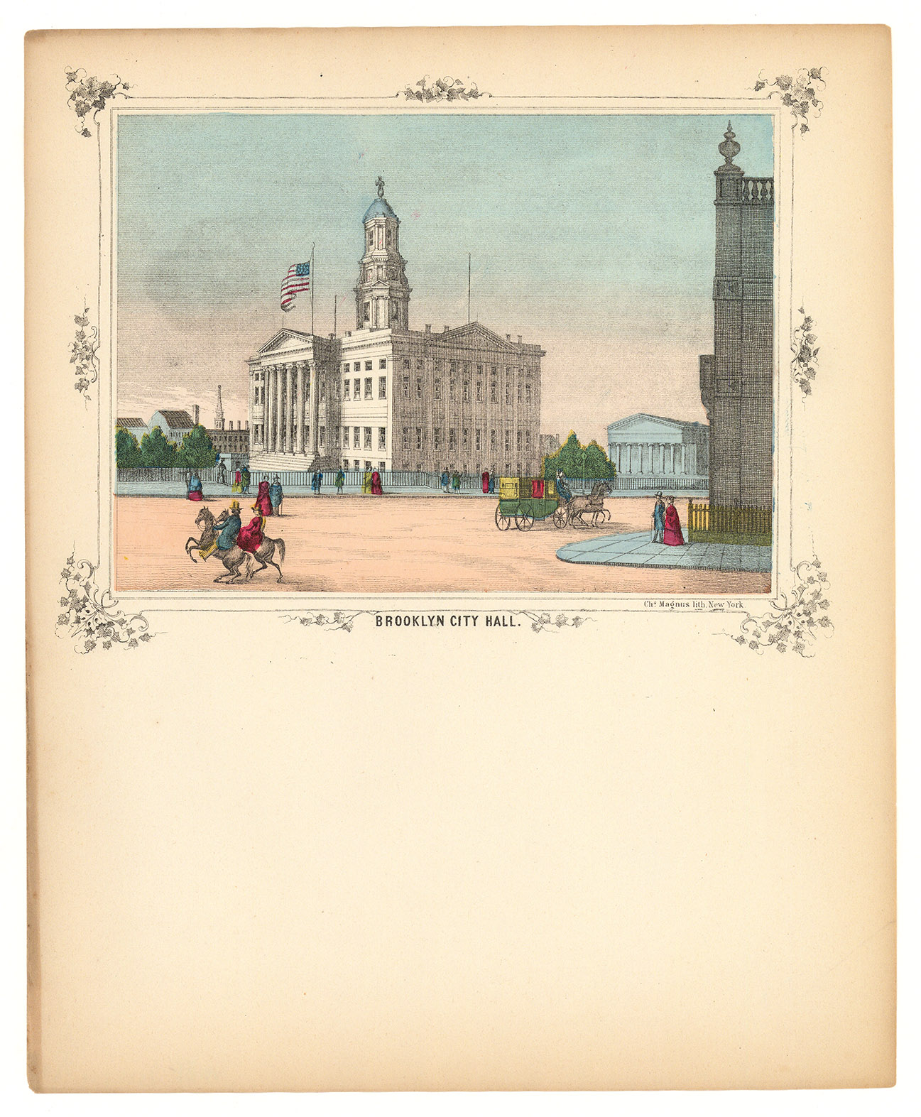 DESCRIPTION: This letter sheet shows newly built Brooklyn City Hall, which is know known as the Brooklyn Borough Hall. The Charles Magnus Company produced a great many letter sheets on many subjects. These subjects include city and town views, as well as historical subjects. Magnus had offices in New York and Washington, D.C. and his dates of operation were from 1858 to circa 1877. The prints produced are well noted for their fine quality.