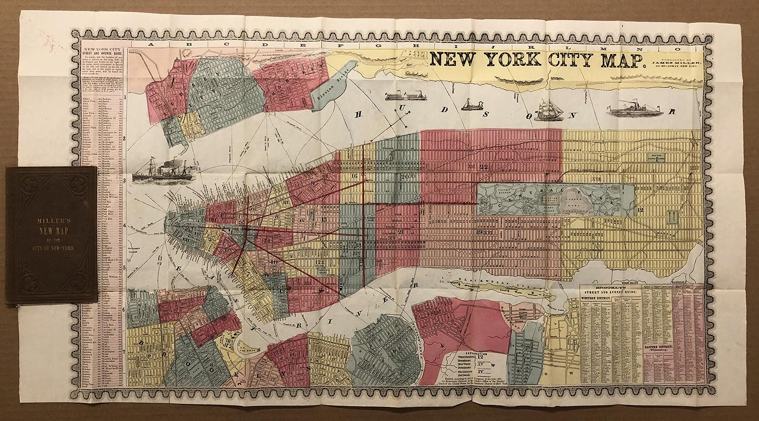 DESCRIPTION: An attractive early guide map of the city. The map is hand colored by ward and somewhat detained. Keys identify streets, wards, fire districts and railroads. Surrounding Manhattan is Jersey City, Hoboken and Elysian Fields, just outside of Hoboken, which is believed to be the site of the first organized baseball game. On the lower edge is Brooklyn Heights, Dumbo, Vinegar Hill, Williamsburgh, Greenpoint, Long Island City and a small portion of Astoria. Also shows early ferry routes between Manhattan, Long Island and New Jersey.