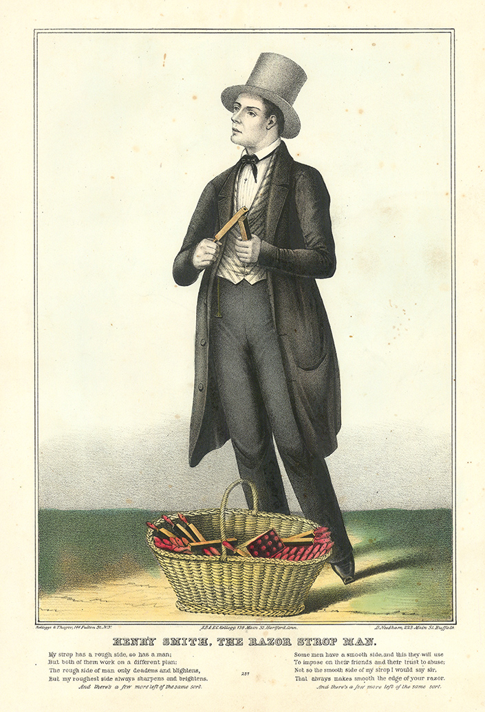 DESCRIPTION: And there's few more left of the same sort"<br><br> Caption reads: My strop has a rough side, so has a man; But both of them work on a different plan; The rough side of man only deadens and brightens, but my roughest side always sharpens and brightens. Some men have a smooth side, and this they will use to impose on their friends and their trust to abuse; Not so smooth side of my strop I would say sir, that always makes smooth the edge of your razor.<br><br> A good description of Henry Smith appeared in the November 22 1870 issue of the Boston Journal.<br><br> "A FEW MORE LEFT," The whereabouts of Henry Smith, the "Razor Strop Man," who formerly made Boston his temporary abiding place, has been unknown to many. A recent article in Scribner's Monthly gives us some idea of his wanderings since he left Modern Athens:<br> "The most renowned street vender in New York, or in the world, is Henry Smith, the 'Razor Strop Man' of Nassau street. Born in England, six months after Waterloo, his youth was roving and dissipated, and his devotion to drink gained him the sobriquet of 'Old Soaker,' before he was twenty-one. Signing the abstinence pledge for a month, and then for life, he became a good husband, an industrious man, and an ardent temperance advocate. In 1842 he sailed in the Ontario for America. Landing in New York, he soon began to sell razor strops, and his street speeches were such droll, witty and sensible mixtures of prose and poetry, that in three months he made himself the prince of peddlers. His sayings were chronicled in the papers, his portrait was published in the Sunday Atlas, and he appeared for seven nights at the Olympic Theatre in Mitchell's play of the Razor Strop Man.' His fame rapidly spread, and he made the tour of the Union, teaching temperance and selling his strops, until his characteristic saying, 'A few more left of the same sort,' became a 'household word.'<br><br> He achieved a fortune in a few years; but the spirit of speculation seized him, and the crisis of 1857 swept away his last dollar. With unshaken courage and a fresh basket of strops he began life anew, visited his ative England, and won much reputation as a 'genuine Yankee peddler.' Returning to America, the war found him at Rochester, where he enlisted in a volunteer regiment. In his left leg he still carries a Gettysburg mus. ket-ball. When told that it might be necessary to amputate the limb, he replied, Well, I suppose I can afford to lose it, as I shall still have one more left of the same sort!' The leg was saved, but the wound disabled him and compeled his return to Rochester, where he served till after the close of the war as recruting sergeant and in the soldiers' hospital. With a purse from the city, a letter of thanks from the Mayor, and a Zouave uniform from his regiment, the veteran vender returned again to New York and became once more the 'Razor-Strop Man' of Nassau street.<br><br> He seems to have been a very talented orator, entertaining crows where ever he set up shop and traveled the country showing up in such cities as New York, Boston, Cleveland, Sandusky, Louisville etc.<br><br> A very scarce print.