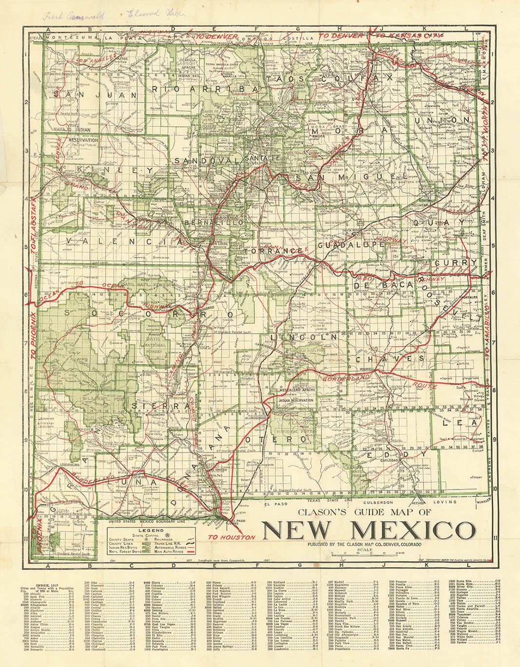 DESCRIPTION: This map of New Mexico identifies automobile roads and railroads. Native American reservations and national forests are highlighted. Index identifies towns with a population of 200 or more.<br><br> Includes original paper covers with a 28 pp. text with place name index, lists of roads and railroads, and general information about the state.