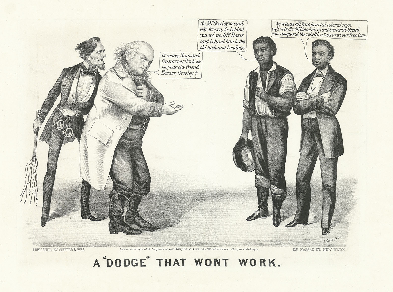 DESCRIPTION: This political caricature is dealing with the Presidential campaign of 1872. Ulysses S. Grant was running for a second term in 1872 on the Republican Ticket. The Republican party split with the Liberal Republican’s and the Democratic party nominating Horace Greeley as their candidate. <BR><BR> In 1870 the 15th Amendment to the Constitution was enacted giving black men the right to vote. There for the 1872 Presidential election was the first election where black voters were courted. There was also plenty of mudslinging in this election cycle this caricature tying Greeley to Jefferson Davis is part of the mudslinging campaign tactics. <BR><BR> Ulysses S. Grant won the election. Horace Greeley died on November 29, 1872 after the popular vote was counted but before the Electoral College had cast their votes. This caused the electors for Greeley to vote for four other candidates. It was also the first time in US history that a Presidential candidate died before the Electoral College votes had been counted. <BR><BR> Bubbles above the figures: <BR> Horace Greeley “Of course Sam and Ceasar, you’ll vote for me and your old friend Horace Greeley? <BR> Black man 1 “No r. Greeley we cant vote for you, for behind you we see Jeff Davis and behind him is the old lash and bondage.” <BR> Black map 2 “We vote, as all true hearted colored men will vote, for Mr. Lincoln’s friend General Grant, who conquered the rebellion & secured our freedom.” <BR>