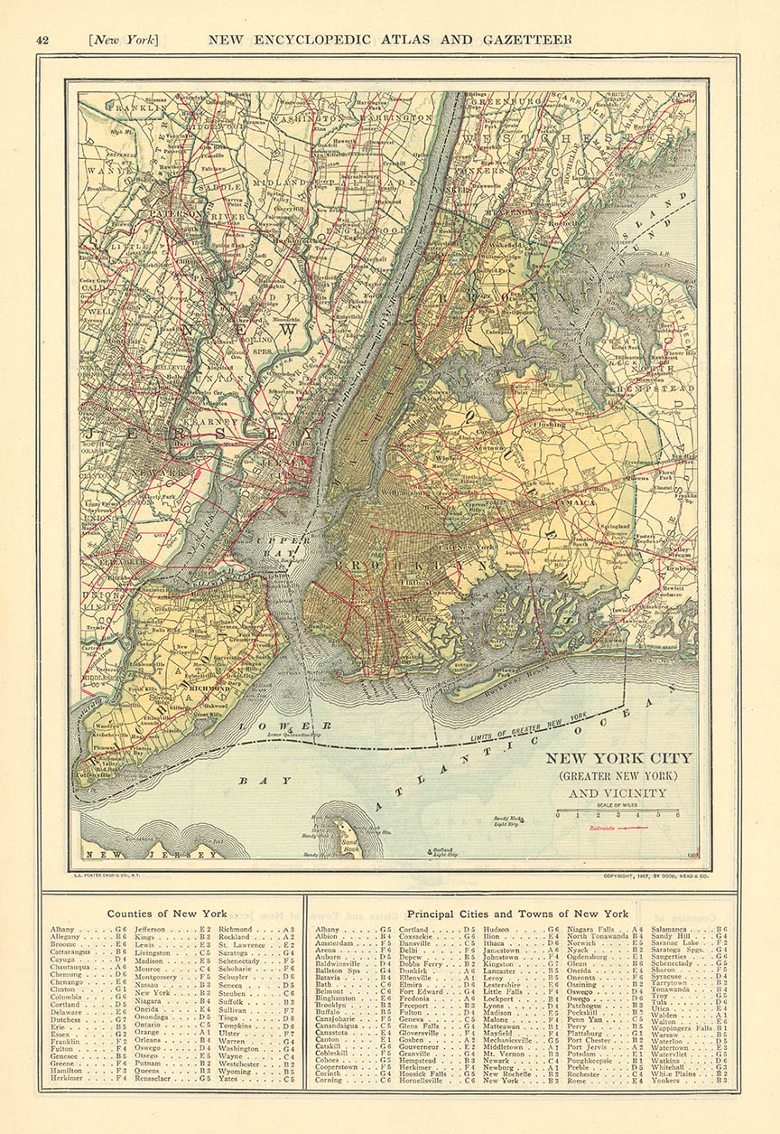 DESCRIPTION: This map appeared in the New Encyclopedic Atlas and Gazetteer" Railroad lines (excluding subways) are outlined in red.
