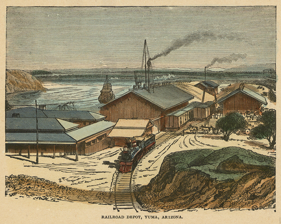 DESCRIPTION: A 19th-century perspective of a Railroad Depot, in Yuma Arizona. Captured as a wood engraving and colorized to highlight the details.