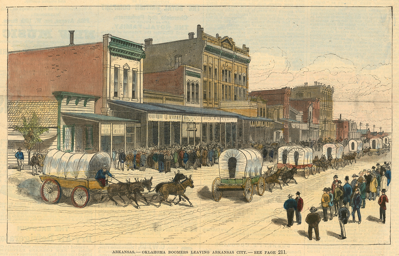 DESCRIPTION: A 19th-century perspective of Arkansas with Oklahoma "boomers" leaving Arkansas City, captured as a wood engraving and colorized to highlight the details.<br><br> After the Civil War, the U.S. government made new treaties with various Indian tribes, resulting in the creation of the Unassigned Lands in central Oklahoma. These lands gained attention in 1879 when Elias C. Boudinot highlighted them in an article, sparking interest in white settlement. Dr. Morrison Munford and others promoted the idea, leading to several settlement attempts, notably by Col. Charles C. Carpenter and David Lewis Payne, who repeatedly led groups into the territory only to be evicted by federal troops. Payne's persistent efforts, despite multiple arrests, galvanized the Boomer Movement, which continued under William L. Couch after Payne's death in 1884. The movement gained momentum with the construction of the Santa Fe Railway and political support, culminating in the Oklahoma Land Run of April 22, 1889, when settlers legally claimed land in the Unassigned Lands. The term "boomer" originated from their figurative noise-making and agitation for their claims.
