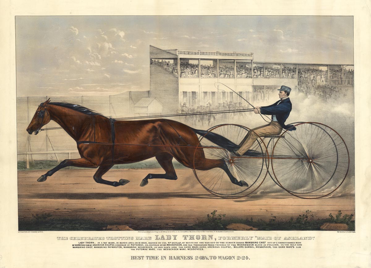 DESCRIPTION: Signed in stone J. Cameron lower right. <BR><BR>Title continues "Lady Thorn, is a bay mare, 16 hands and 1 inch high, raised by Col Wm Dunlap, of Kentucky. She was got by the Famous Horse Mambrino Chief out of a thoroughbred mare : By Gano (who was by American Eclipse,) Grandam by Potomac, Gr. Grandam by Imp. Messenger, she has therefore three corsses of the Messenger blood as Follows, on the male side : Mambrino Chief, Mambrino Paymaster, Mambrino Messenger, on her Dams side the Gano Mare, Gano, American Exlipse, Miller's Damsel, Messenger, the Gano Mare's Dam : The Potomac Mare, The Messenger Mare. Messenger.<BR><BR>Lady Thorn is next to Dexter as the best trotting horse of all time.