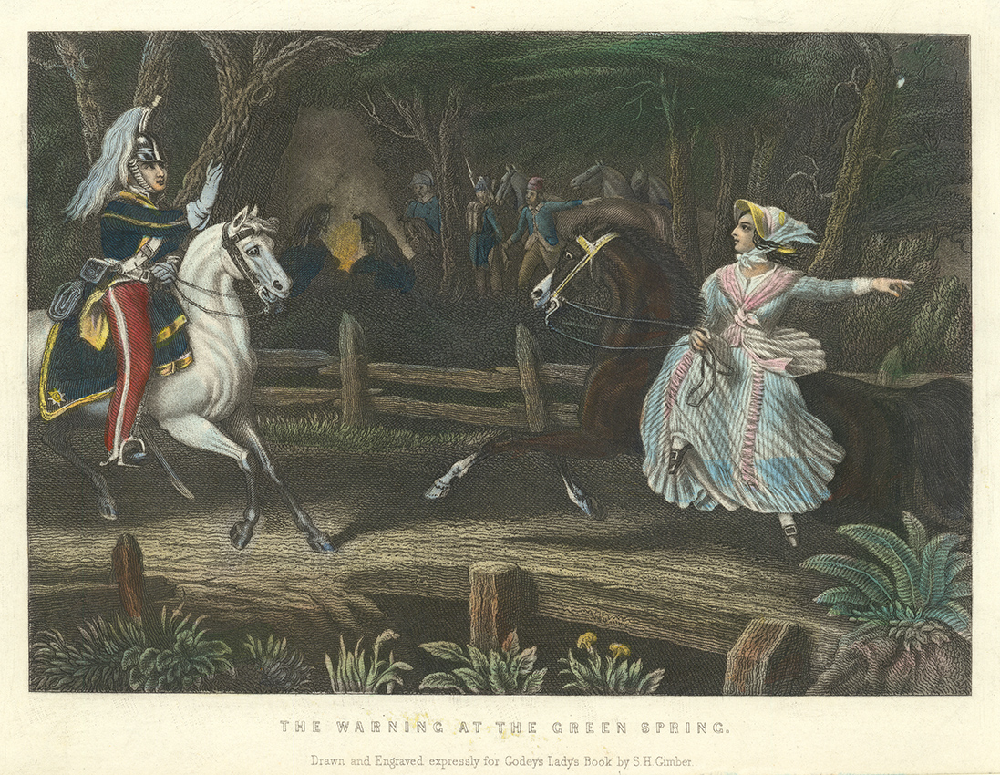 DESCRIPTION: A 19th-century perspective of The warning at the Green Spring, captured as a steel engraving and colorized to highlight the details. Engraving, c. 1850. Published by Godey's Lady's Book. Mrs. Dillard, a courageous and resourceful woman from Spartanburg District, played a crucial role in the American Revolutionary War by providing invaluable intelligence to the patriot forces. Residing near the Green Spring, she discovered that a party of Tories led by Ferguson and Dunlap planned to ambush Colonel Clarke and his men, who were encamped nearby. Despite the late hour and the darkness, Mrs. Dillard rode swiftly on horseback to warn Clarke of the imminent danger. Her timely warning allowed the American forces to prepare for the surprise attack, ultimately leading to their victory over the Tories. Mrs. Dillard’s bravery and quick thinking exemplify the significant contributions women made to the Patriot cause, often at great personal risk. Her actions not only saved Clarke's men but also underscored the critical role of women in the fight for American independence.