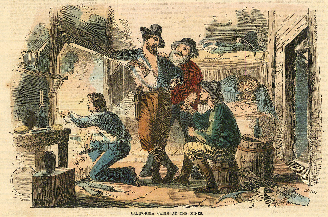 DESCRIPTION: A 19th-century perspective of California Cabin at the Mines, captured as a wood engraving and hand colored to highlight the details.