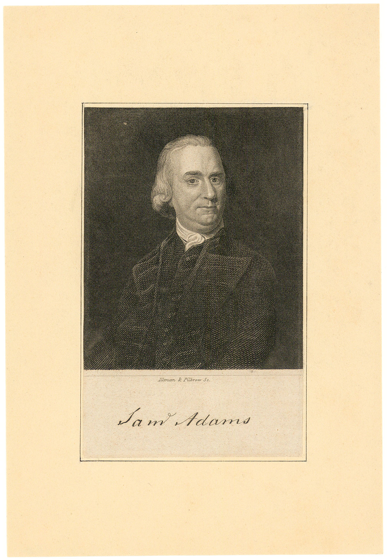 DESCRIPTION: This small portrait, titled "Sam Adams," is an engraving by Illman & Pilbrow, depicting Samuel Adams (1722-1803), one of the Founding Fathers of the United States. The engraving captures Adams' distinguished appearance, showcasing the meticulous detail and craftsmanship of the engravers. The portrait has been drum mounted to a sheet of paper by a previous collector. The portrait reflects the historical significance of Samuel Adams, known for his pivotal role in the American Revolution and his contributions to the formation of the nation