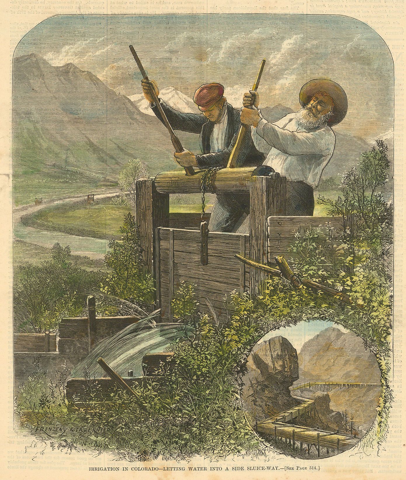 DESCRIPTION: A 19th-century perspective of Irrigation in Colorado - Letting Water into a Side Sluice-Way, captured as a wood engraving and hand colored to highlight the details. <br><br> Drawn by Paul Frenzeny and Jules Tavernier.