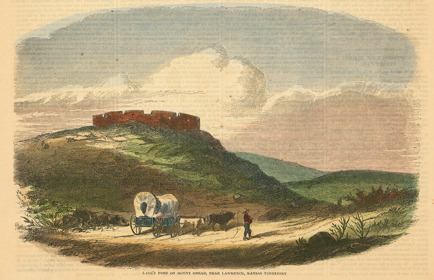 DESCRIPTION: A 19th-century perspective of Lane's Fort on Mount Oread, near Lawrence, Kansas Territory, c. 1859, captured as a wood engraving and handcolored to highlight the details. The scene depicts the rough, irregular limestone structure with embrasures for cannons, surrounded by the rugged landscape. <br><br> Fort Lane, located in Douglas County, Kansas, was an unofficial fort established in 1856 and named after James H. Lane. It served as a stronghold for Free-State men during the Kansas-Missouri Border War. Built by Lawrence residents atop Mount Oread, it functioned as a lookout post to monitor potential attacks on Lawrence amidst the conflict over Kansas' status as a free or slave state. Abandoned in 1857 and destroyed during William Quantrill’s Raid in August 1863, the U.S. Army established another fort on Mount Oread in February 1864. The image depicted is the original fort, prior to the one built by the Army in 1864. <br><br>
