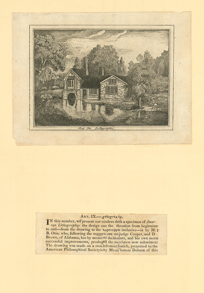 DESCRIPTION: Widely considered to be the first lithograph created and published in the United States.<br><br> The Analectic Magazine (1813–1820) was published in Philadelphia by Moses Thomas, and later, by James Maxwell. Washington Irving served as editor 1813-1814. The magazine was described as "comprising original reviews, biography, analytical abstracts of new publications, translations from French journals, and selections from the most esteemed British reviews." <br><br> Some issues contained reprinted articles from the British press, and extensive book reviews. "The first lithograph ever made in America is in this magazine for July 1819. It represents a woodland scene - a flowing stream and a single house upon the bank. It was made by Bass Otis." The publication ceased in 1820 when James Maxwell became ill