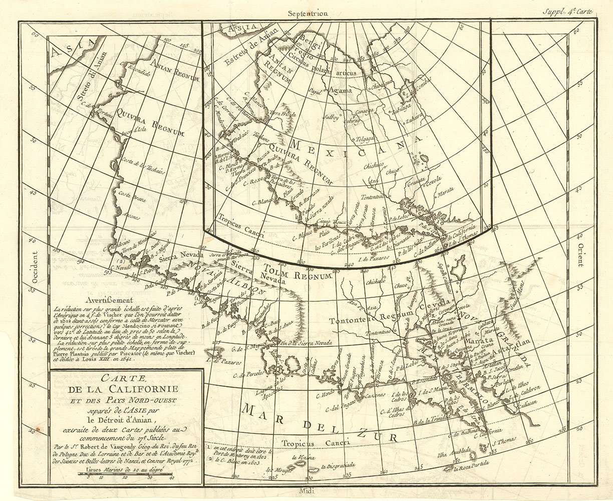 DESCRIPTION: This map is a study in the comparative cartography of the West Coast of North America from the Straits of Anian (Bering Straights) to Cabo San Lucas at the southern tip of Baja California. The upper inset map also shows the same area based on Plancius' map of 1641 showing a northern sea, clearly portending a NW Passage in the Arctic Circle. This map appeared in the supplement to the Diderot and d'Alembert "Encyclopedie," 1770-79