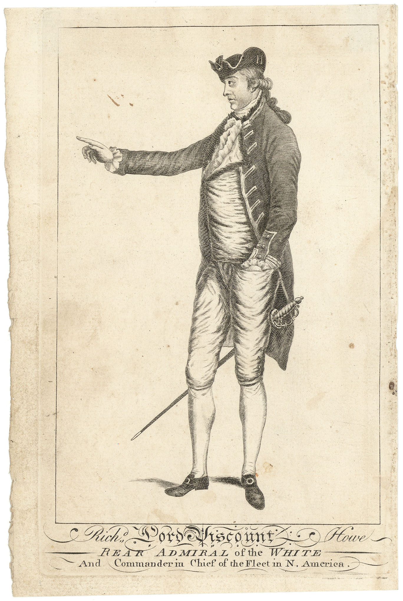 DESCRIPTION: This 1777 engraving from The Hibernian Magazine presents a full-length portrait of Admiral Richard Howe in uniform, his right arm extended in a commanding gesture. The image captures Howe’s authoritative stance, reflecting his high rank and his significant role during the early years of the American Revolutionary War, where he led British naval forces and attempted negotiations with the American colonies. Published during the conflict, the engraving served to keep British readers connected to prominent figures involved in the war. <br><br> This image was later reused in Edmund Burke's An Impartial History of the War in America Between Great Britain and Her Colonies, published in 1780, appearing on page 327. The book version shows slight differences, most notably the prominent page number “327” in the upper right corner, a detail that helps distinguish it from the original magazine engraving.