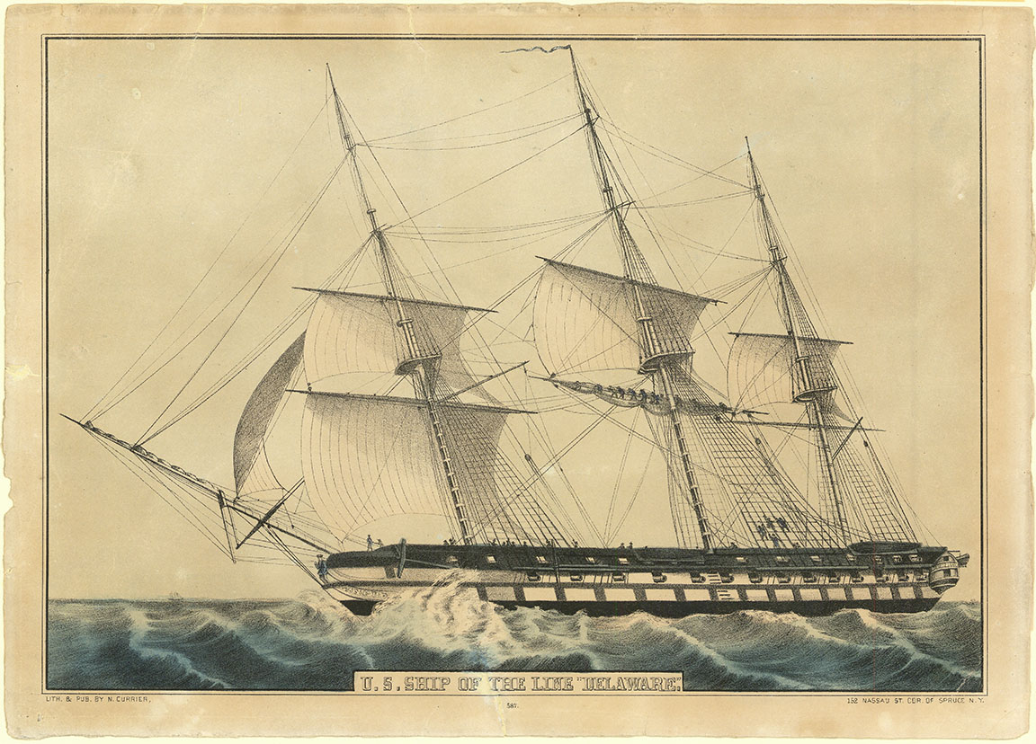 DESCRIPTION: The U.S.S. Delaware was a 74 gun ship of the line. She was launched in October 1820. She was later burned at the Norfolk Navy Yard on April 20th 1861 to prevent her from falling into Confederate hands.<br><br> A scarce print.