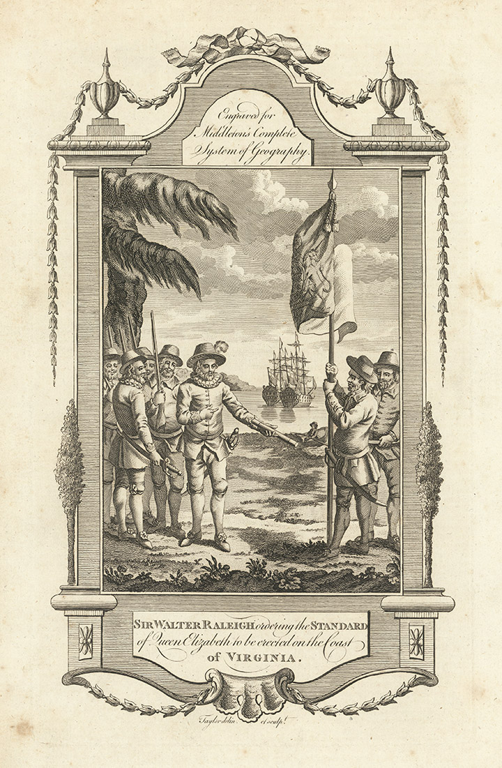DESCRIPTION: Drawn and engraved by Taylor for "Middleton's Complete System of Geography."<br><br> Raleigh [c. 1552 – 1618] was an English statesman, soldier, writer and explorer. A notable figure of the Elizabethan era, he played a leading part in English colonization of North America, suppressed rebellion in Ireland, helped defend England against the Spanish Armada and held political positions under Elizabeth I. Wikipedia.