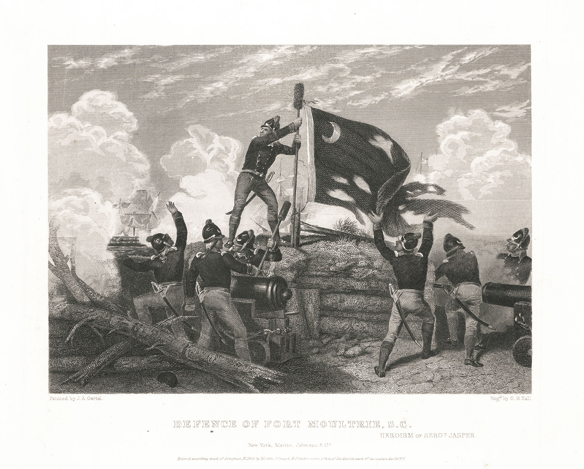 DESCRIPTION: Engraved by G. R. Hall. "Heroism of Sergt. Jasper." During the siege of Charleston the flag was struck down - Sergeant William Jasper placed it back. Nicely detailed - through the battle smoke you can see part of a ship.<br><br> The Battle of Sullivan's Island, aka, the Battle of Fort Sullivan was fought on June 28, 1776, during the American Revolutionary War. It took place near Charleston, South Carolina, during the first British attempt to capture the city from American forces.