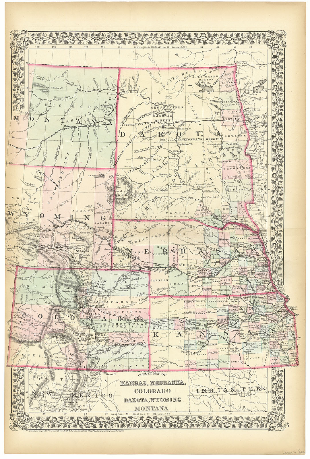 DESCRIPTION: A nice map of the western sates of the Great Plains and eastern Rocky mountains. Colorado is shows the signs of its mining boom. Wyoming delineates only four counties, and is still largely unexplored in the north, as is Montana.<br><br> The map gives many Native American names, reservations, forts, rivers, mountains, railroads, both completed and proposed, explorers routes, etc.