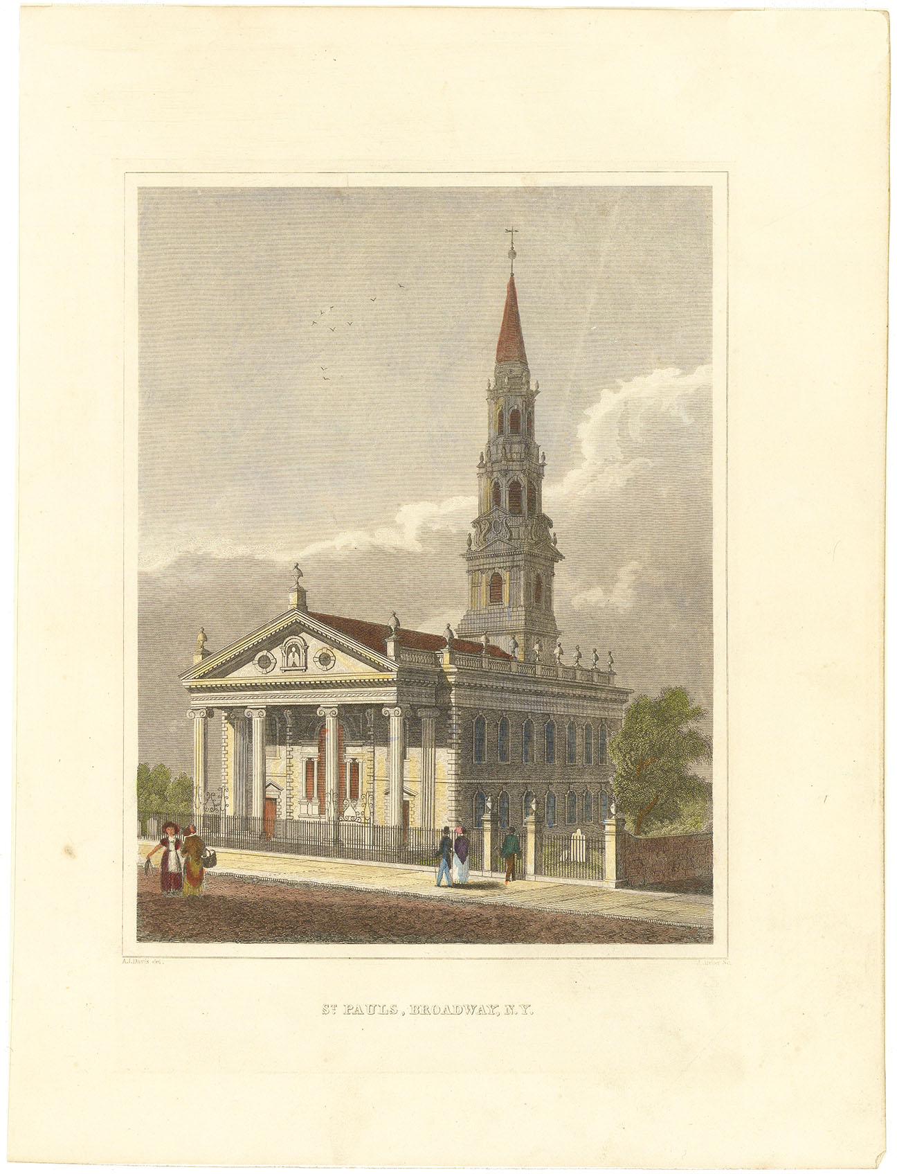 DESCRIPTION: Engraved by J. Archer., this c. 1835 hand-colored print depicts St. Paul's Chapel, a historic chapel building of Trinity Church in New York City.