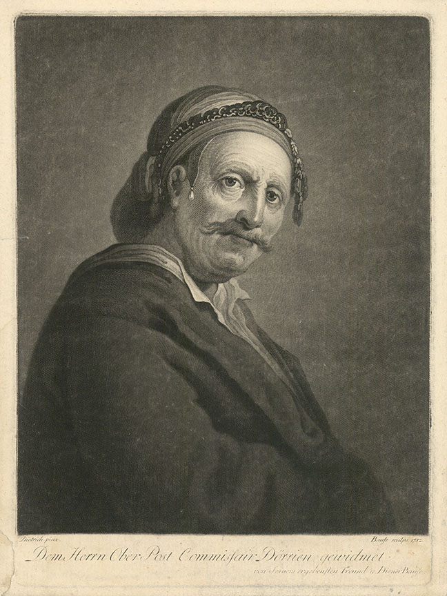 DESCRIPTION: This mezzotint by Johann Friedrich Bause, after a painting by Christian Wilhelm Ernst Dietrich (1712–1774), exemplifies the technical and artistic mastery of the medium. The work depicts an older gentleman rendered with remarkable precision, showcasing intricate details such as the charm adorning his hat and the remarkable detail in his eyes, which imbue the subject with a sense of vitality and character.<br><br> Bause’s skillful use of tonal gradation enhances the dramatic interplay of light and shadow, faithfully capturing the dynamic movement and intricate nuances of Dietrich’s baroque-inspired composition. The engraved dedication to Herr Oberpost Commissary Dörrien reflects the era’s tradition of honoring patrons, adding historical significance to the piece. This mezzotint stands as a testament to Bause’s ability to elevate portraiture, combining technical brilliance with a profound sensitivity to his subject, embodying the refinement and grandeur of 18th-century engraving at its finest.