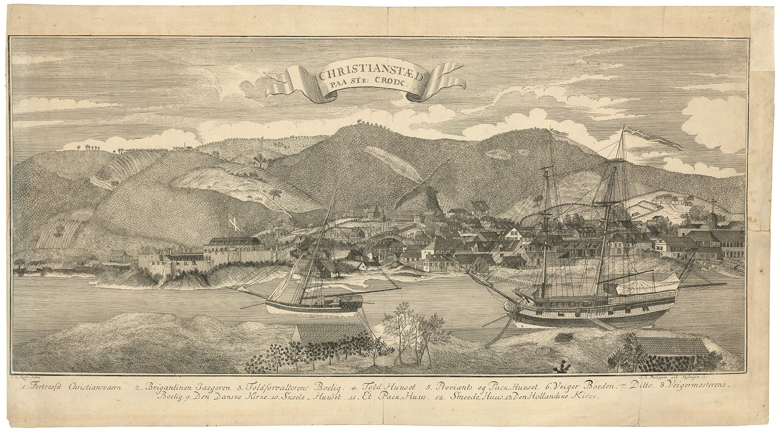 DESCRIPTION: A rare view of the town of Christiansted on the island of Saint Croix. A numbered key identifies 12 prominent buildings and the Brigantine "Jaegeren". This view was drawn by the noted botanist, surveyor, engineer and general Danish governmental official, Julius Philip Benjamin von Rohr, (1737-1793). This view is taken from Protestant Cay.<br><br> The copper plate was engraved by Johanna Dorothea Sysang, (1729-1791) aka Johanna Dorothea Philippin, the first female engraver based in Leipzig. She was tutored by her father, Johann Christoph Sysang, a master engraver in his own right..