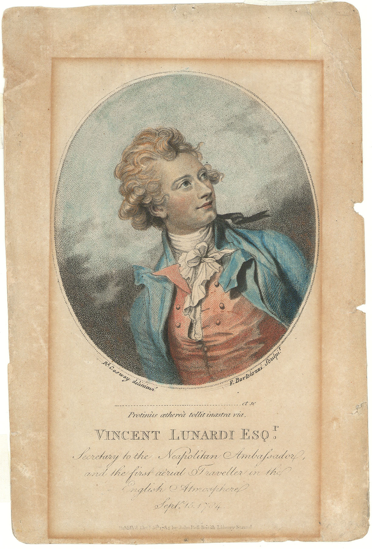 DESCRIPTION: A handcolored stipple engraving of Vincent Lunardi, drawn by Richard Cosway and engraved by Francesco Bartolozzi, captures the pioneering aviator gazing skyward, a pose symbolizing his daring ambition and the spirit of early aviation. Ballooning, which began in France in 1783, quickly spread across Europe, captivating imaginations. Lunardi brought this phenomenon to Britain in 1784, presenting his hydrogen balloon to the Prince of Wales and a captivated public. <br><br> Despite an impatient crowd forcing him to ascend prematurely—without his planned companion, George Biggin—Lunardi’s historic flight from London’s Artillery Ground to Standon Green End in Hertfordshire was a resounding success. Accompanied instead by a cat, a dog, and a caged bird, he erased British skepticism about ballooning and achieved instant fame. This portrait serves as a fitting tribute, capturing the visionary spirit of one of aviation’s earliest pioneers.