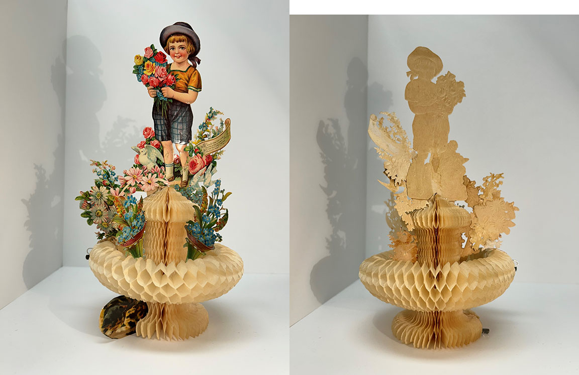 DESCRIPTION: Full-circle white honeycomb with die-cut attachments of a central child holding a bouquet of roses. Additional flowers and doves come up through the honeycomb - two notes are attached, one is the title. At the very bottom, a curled-up cat sleeps.