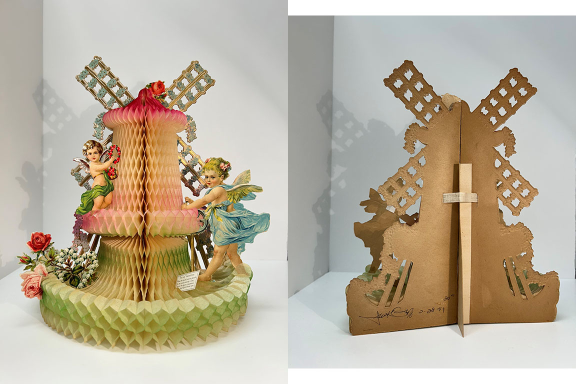 DESCRIPTION: White honeycomb in a windmill shape - the top is air-brushed red/magenta and parts of the bottom section are air-brushed green—embossed, printed, die-cuts of an angle and cherub with a sprinkling of flowers.
