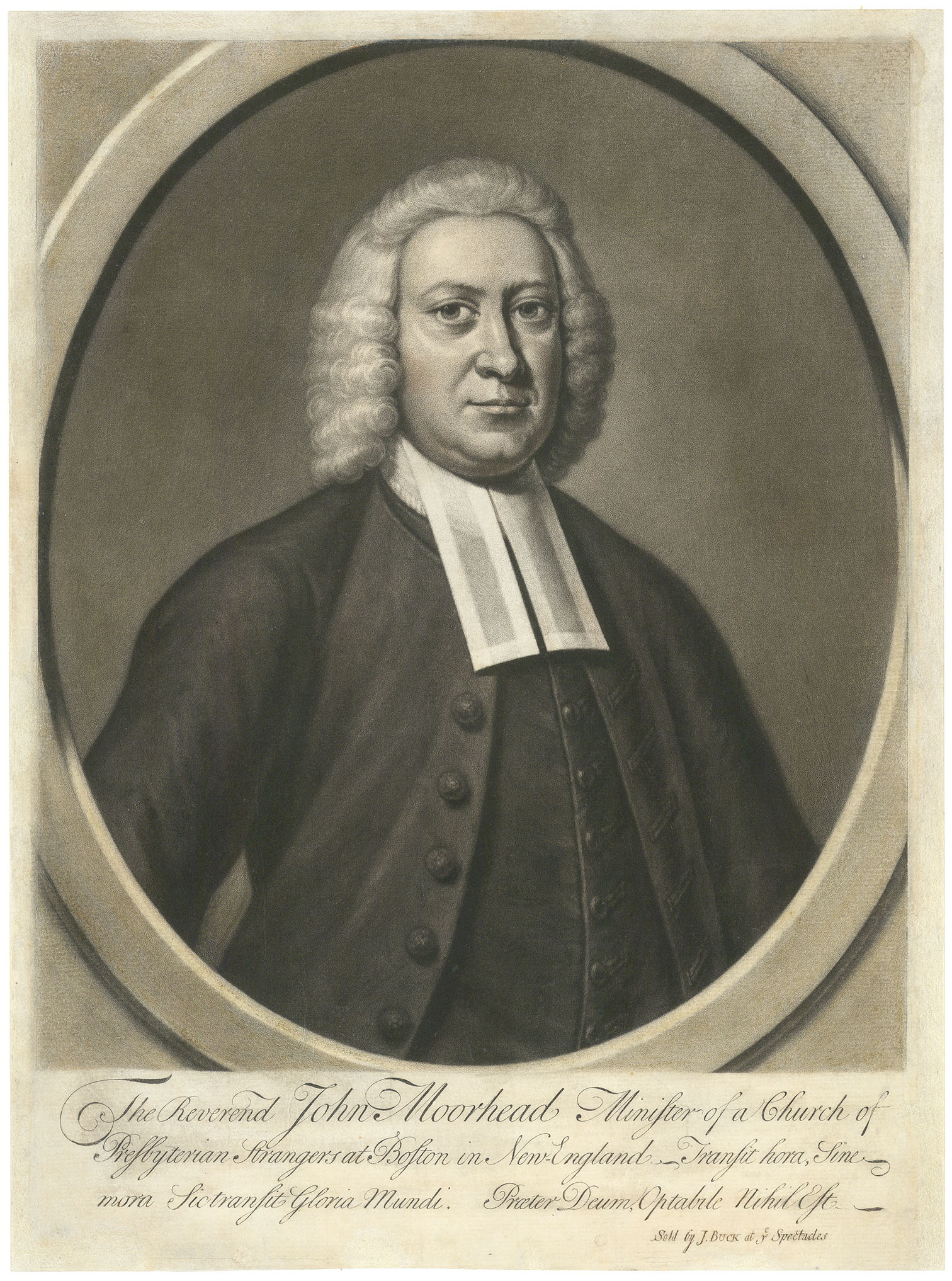 DESCRIPTION: Rev. John Moorhead (1703-1773). He was born in Newton, near Belfast, County Down, Ireland (Ulster), and educated in Edinburgh, before arriving in Massachusetts. All accounts indicate that he was a very pious minister, who engaged in family visitation, catechism, and a faithful ministry of the Word. He was well regarded by his flock. The congregation began as a group of Scot-Irish Calvinists and held worship in a converted barn on Long Lane in Boston on November 15, 1729, with the first Pastor being the Reverend John Moorhead. The inhospitable residents of Boston dubbed them derogatorily as "The Church of the Presbyterian Strangers”, and the name stuck.<br><br> Peter Pelham was born in London c.1697. In 1713 he apprenticed to John Simon, a leading engraver of mezzotints. Afterwards he found employment with various printsellers producing mezzotints. While in London he is known for producing at least twenty-six portraits. In 1726 or 1727 he emigrated to America with his wife and two sons. He settled in Boston and established a school where he taught writing, reading, dancing, painting, and needlework. He also practiced his work as an engraver of mezzotints. His first mezzotint, made in 1728, was of the prominent Puritan minister, Cotton Mather. He produced a total of sixteen engraved works including a map, “Plan of Louisbourg.” He is one of the earliest resident artists working in America and is believed to have produced the first mezzotint in the colonies. Pelham was stepfather to the artist, John Singleton Copley, through his third marriage to Mary Singleton. His son, Henry Pelham, is known to have produced a large map of Revolutionary era Boston. His prints are seldom seen and are considered to be of great rarity.