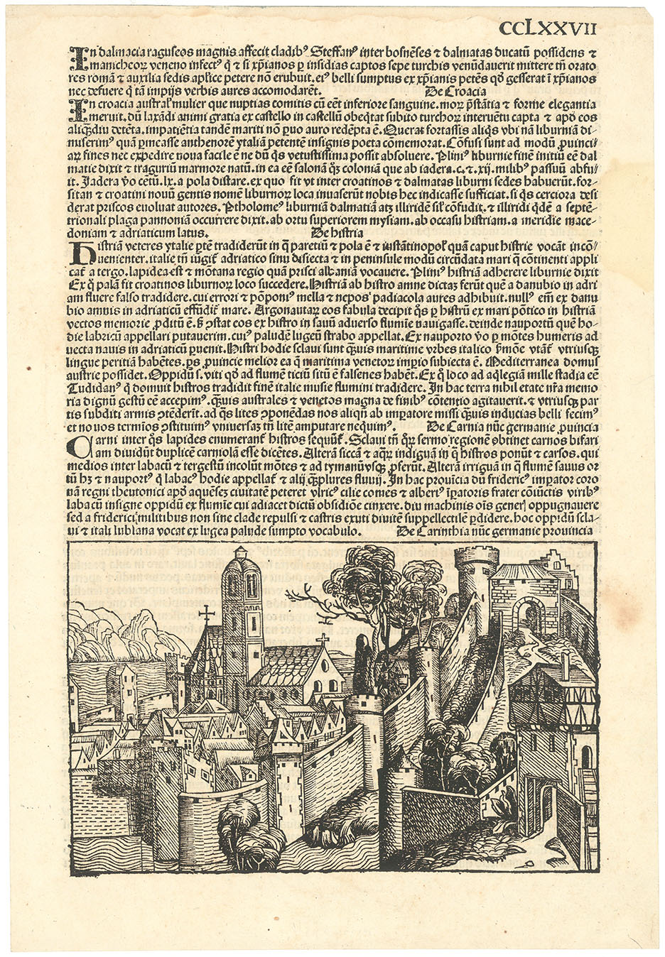 DESCRIPTION: This leaf, Folium CCLXXVII (recto) from the Nuremberg Chronicle (1493), is part of one of the most ambitious and influential illustrated books of the 15th century. Compiled by Hartmann Schedel and printed by Anton Koberger, the Chronicle presents a sweeping history of the world, interweaving religious narratives, biblical events, historical figures, and medieval conceptions of geography and knowledge. Published in both Latin and German editions, it features hundreds of woodcut illustrations by Michael Wolgemut and Wilhelm Pleydenwurff, with possible contributions from a young Albrecht Dürer. The text reflects the Chronicle’s fascination with historical and political transformations, recounting the conflicts and shifting powers of Dalmatia, Croatia, Istria, Carniola, and Carinthia. It describes King Stephen of Dalmatia’s wars against Ragusa (modern-day Dubrovnik) and the broader struggles for control in the region, blending historical record with the medieval perspective on power, faith, and territorial rule. <br><br> The woodcut illustration on this page likely depicts Ragusa, a city of great significance in the medieval Adriatic. While the Chronicle often presents stylized rather than strictly accurate representations of cities, the image captures key architectural features associated with Dubrovnik, including its imposing walls and numerous towers. These fortifications were essential to the city’s defense, reflecting its role as a resilient stronghold amid ongoing regional conflicts. Like many of the Chronicle’s city views, this depiction serves both artistic and historical purposes, emphasizing the strength and endurance of a city that withstood the pressures of war and shifting political landscapes. Through such illustrations, the Nuremberg Chronicle transforms historical accounts into vivid visual records, reinforcing the medieval perspective on power, faith, and the impermanence of earthly kingdoms.