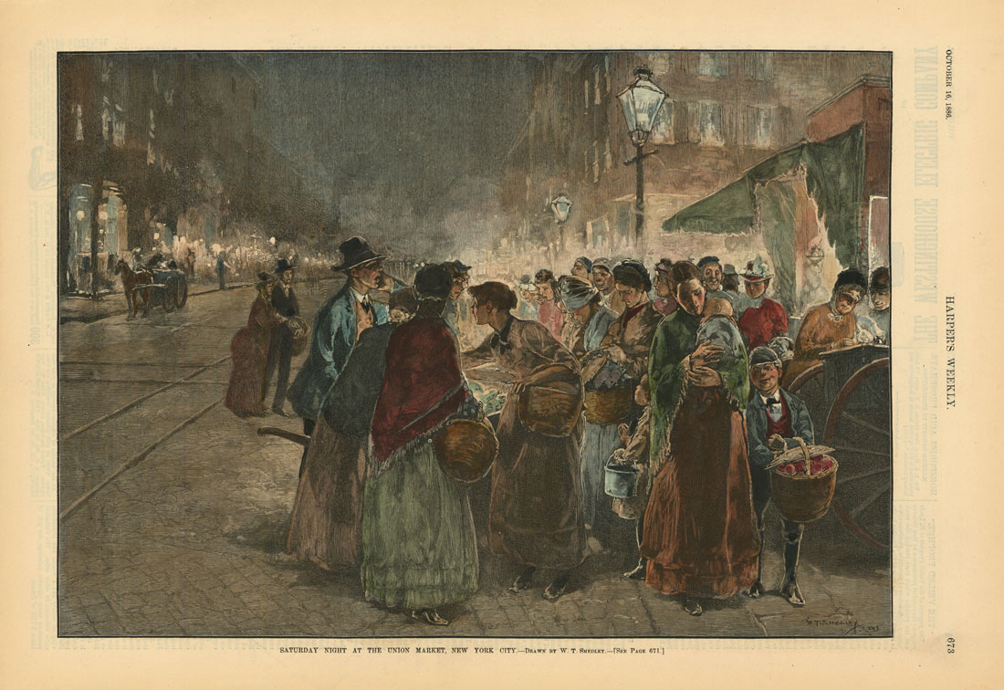 DESCRIPTION: This print, published in Harper's Weekly on October 16, 1886, captures the bustling activity of "Saturday Night at the Union Market, New York City," offering a vivid glimpse into the lively weekend commerce and community interactions at one of the city's popular markets.