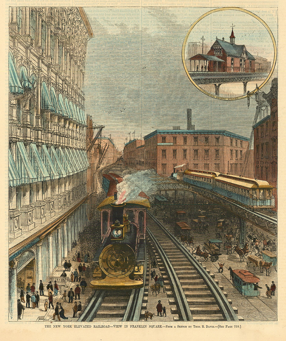 DESCRIPTION: The New York Elevated Railroad - View in Franklin Square (Published in Harper's Weekly, New York, September 7, 1878) This Harper's Weekly print captures the New York Elevated Railroad cutting through Franklin Square, illustrating the dramatic changes urban rail brought to 19th-century city life. The image highlights the elevated tracks with trains above the busy streets, symbolizing the era's technological progress and its impact on New York City's development.