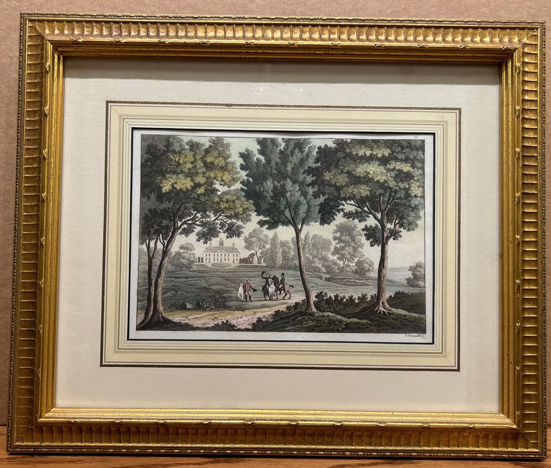 DESCRIPTION: This aquatint after George Isham Parkyns, executed by Paolo Fumagalli and published in Il Costume Antico e Moderno… l’America, a comprehensive 21-volume work by Giulio Ferrario. Issued in Milan by Antonio Fortunato Stella, the series documented the customs, architecture, and landscapes of various cultures, including the Americas. This particular engraving presents a view of Mount Vernon’s west front, capturing the grandeur and neoclassical symmetry of George Washington’s estate. Printed with the number “47” in the upper-right corner and signed “P. Fumagalli f.” in the lower-right, the image reflects Ferrario’s dedication to historical and geographical illustration. As the founder of the Società Tipografica de’ Classici Italiani and director of the Braidense National Library in Milan, Ferrario played a crucial role in curating visual representations of world heritage. The work of Fumagalli, an Italian engraver, brings precision and depth to Parkyns' original design, translating the stately elegance of Washington’s residence into an atmospheric aquatint.