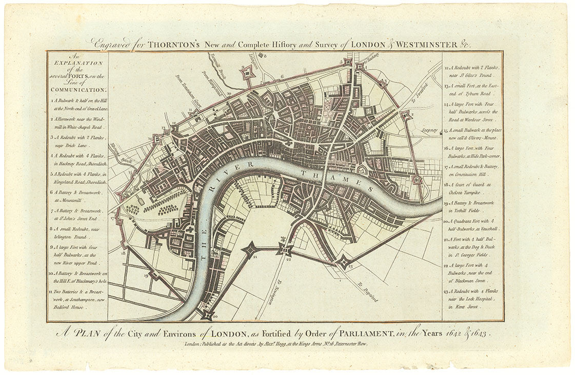 DESCRIPTION: The construction of the fortifications that would become known as the 'Lines of Communication' was first directed on the 10th August 1642. However, according to historian Simon Marsh, it was not until 24th October, in the aftermath of the Battle of Edgehill, that the City of London's Militia Committee ordered that "ramparts and trenches" be constructed around the City of London and its suburbs.<br><br> A numbered key identifies 23 positions.<br><br> This map appeared in Thornton's New and Complete History and Survey of London and Westminster.