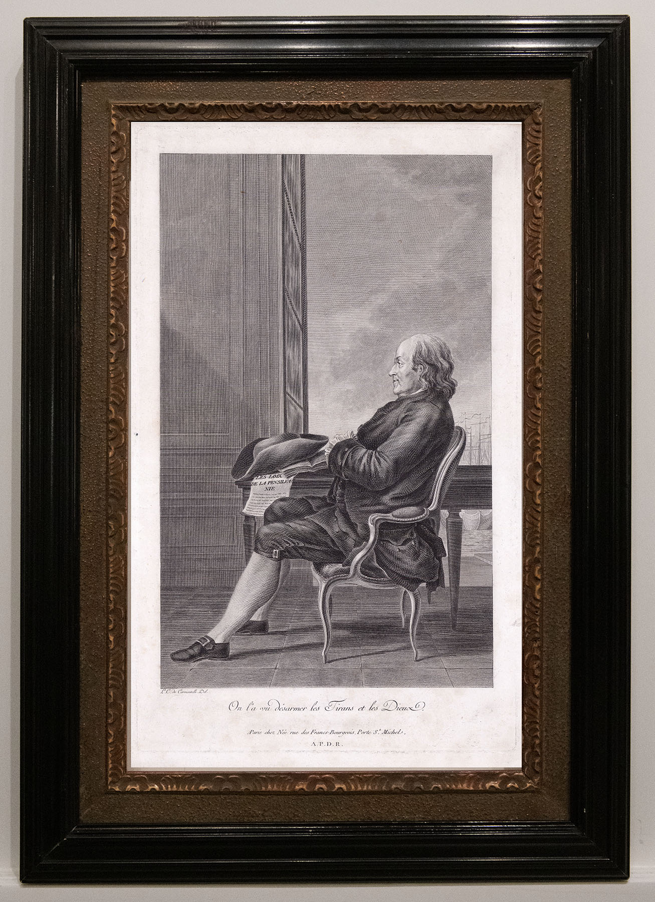 DESCRIPTION: This engraved portrait of Franklin is based on a watercolor by Carmontelle. The engraving shows Franklin seated in an armchair, depicted in profile, with a natural and informal posture. Behind him is a desk, with a tricorner hat poised on the corner, atop an open book and a scroll reading “Les Loix De La Pensilvanie”. Behind him, an open window hints a port scene, with the masts of several vessels and water peeking through the window. The inscription below the print is the French rendering of Turgot’s Latin “Eripuit coelo fulmen sceptrumque tirannis”. In English, it translates to “He seized lightning from the heavens and the scepter from tyrants”. br><br> Benjamin Franklin (1706-1790) is considered to be one of the greatest of all of our founding fathers. A highly intelligent man, over his lifetime he was an able scientist, a writer, printer and publisher. He was one of the most successful diplomats that the United States ever had. During the Revolutionary War, he acted as American Minister to France, successfully gaining French support for the American cause. He was also the only person who signed all four of the key documents in American history: The Declaration of Independence; The Treaty of Alliance with France; The Treaty of Peace with Great Britain; and The Constitution of the United States. <br><br>
