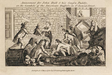 DESCRIPTION: Designed for London’s European Magazine, this humorous quip comments on the similarities between the American and the Irish rebellions. Weakened by the conflict in America, Britain was forced to withdraw its troops from Ireland and send them to the colonies. Ireland took this opportunity to assert its independence, and although the Irish forces pledged themselves to George III, they renounced the new government. The British government was forced to loosen its control, and Ireland became more self-governed. Anarchy has erupted when the American buffalo charges through St. James’s Street. People are toppled and wares are scattered across the cobblestones. Fox’s new coalition desperately attempt to retrieve the loaves and fishes, symbolizing their new policies, which have been knocked aside by the charge of the buffalo. Although restrained by Edward Thurlow, the buffalo is ready to charge again. In a window, George III watches the scene with an expression of amusement. This fascinating satire is one of the earliest prints to represent America as a buffalo.