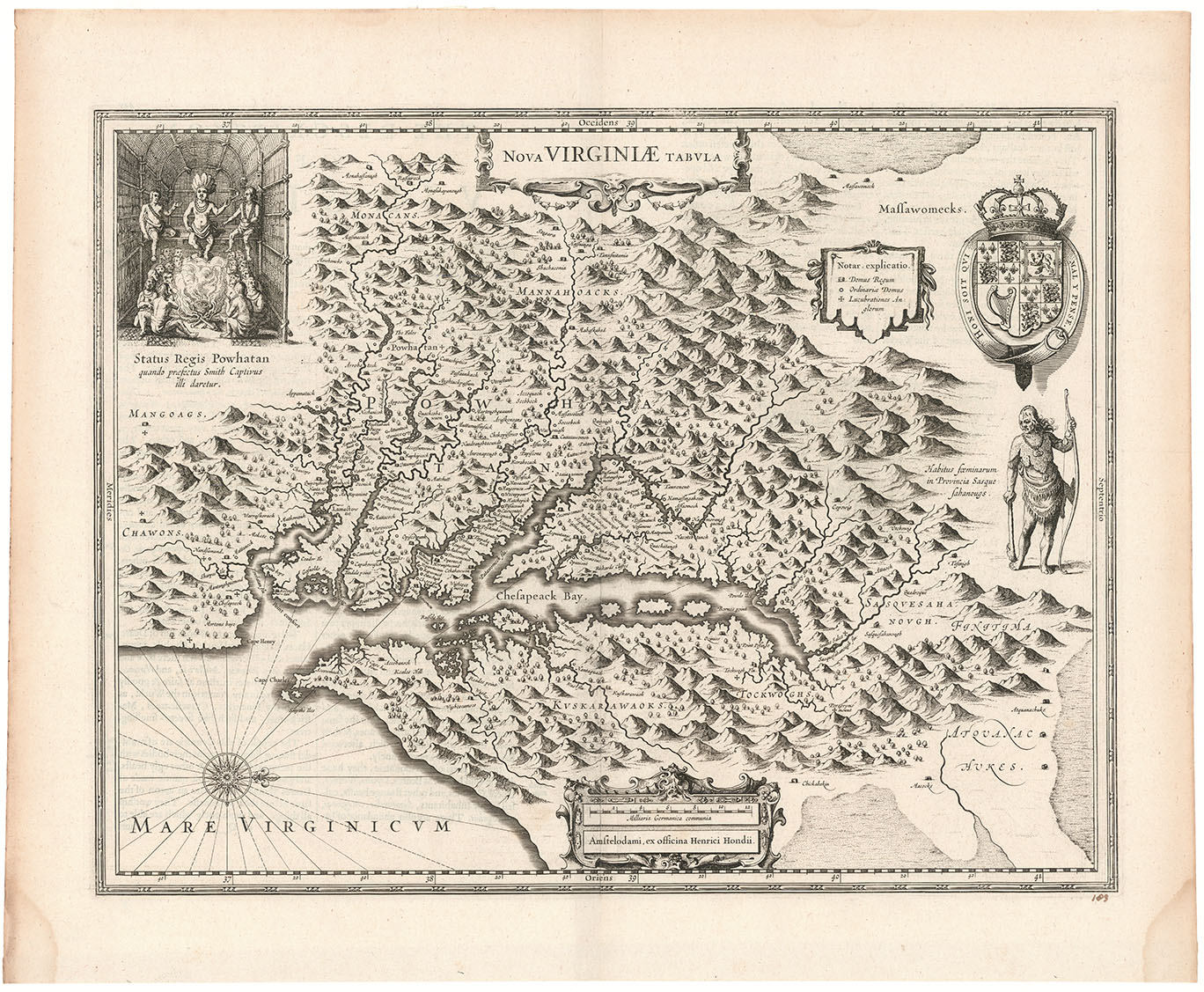 DESCRIPTION: A rare English text version. <br><br> This map, in the Jodocus Hondius version, (1618) was the first derivative of the highly important John Smith Map of Virginia of 1612 which was first to depict the bay and its tributaries with any accuracy. Jodocus Hondius first issued the map in 1618 but only small handful was printed. In 1629 Jodocus died and his widow, unbeknownst to his brother Henricus, sold the copper plate to firm of Willem Blaeu. Henricus had to re-engrave an entirely new plate which was issued in 1630. In the upper left corner is an image the great Indian chief Powhatan surrounded by his subjects. In the upper right is the British Royal Arms, below that is an image of an Indian warrior armed with a bow and war club. <br><br.>