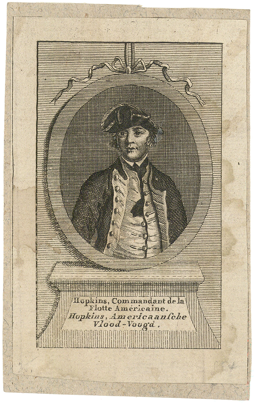 DESCRIPTION: A small oval engraving of Esek Hopkins, titled in both French and Dutch: “Hopkins, Commandant de la Flotte Américaine” and “Hopkins, Americaansche Vlood-Voogd”, likely published circa 1780. The portrait presents Hopkins in naval uniform, turned slightly to his left, framed within a finely ruled oval. The bilingual caption—featuring the distinctive Dutch term Americaansche Vlood-Voogd, meaning “American Guardian of the Fleet”—reflects contemporary European interest in the American Revolution. This compact yet detailed engraving offers a rare period likeness of the first commander-in-chief of the Continental Navy, produced for French and Dutch-speaking audiences during the war.
