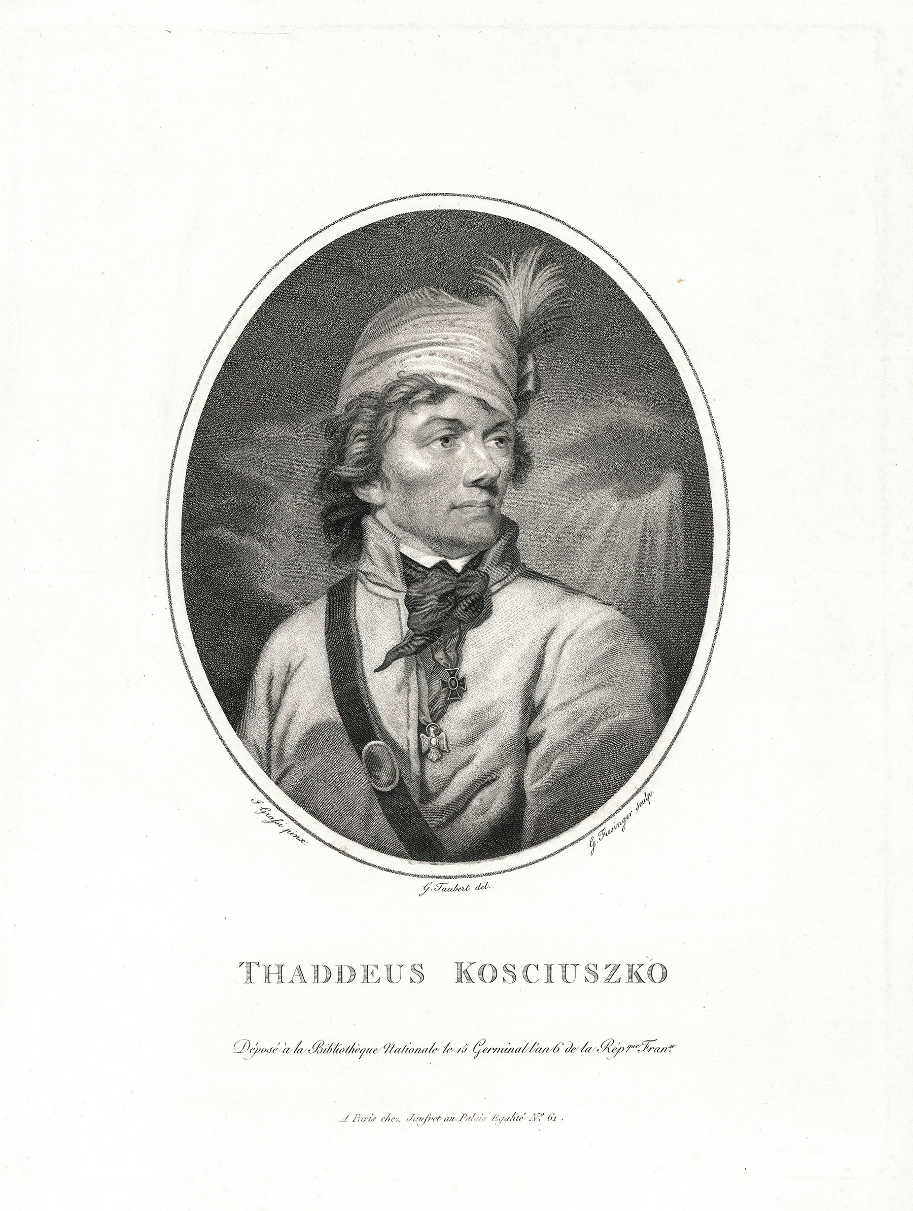 DESCRIPTION: J. Grassi pinx; G. Taubert del; G. Fiesinger Sculp. Depose a la Bibliotheque Nationale… .<br><br> <b>A dramatic bust portrait of the Polish patriot Thaddeus Koociuszko. Shown wearing a feathered cap, the polish Cross of Valor and an Order of the Cincinnati medal.</b> <br><br> Andrzej Tadeusz Bonaventura Koociuszko (1746-1817), a.k.a. Thaddeus Kosciuszko, was a Polish born general, military engineer, and revolutionary. He fought in the American Revolutionary War, as well as an uprising in his home country. He was known for his bravery, kindness, patriotism, likeability, and unwavering strength of character.<br><br> Arriving in Philadelphia in August of 1776, and soon proved his worth by designing blockades and fortresses along the Delaware River, Kosciuszko was given the rank of colonel by Congress in October 1776. In December, he designed Fort Mercer in Red Bank, New Jersey. In the summer of 1777, he ordered the troops retreating from Ticonderoga to delay the British by felling trees and moving boulders onto the path and diverting and damming streams to turn the woodland path into swamps. In the autumn of 1777, Kosciuszko's structures and use of topography contributed to the American victory at Saratoga.<br><br> Reaching Fort West Point in New York in March 1778, Kosciuszko heavily fortified the base along with a section of the Hudson River that it overlooked. It was here that he met Agrippa Hull, a black New-Englander who would accompany Kosciuszko for the rest of the war as his servant, assistant, and companion.<br><br> In the summer of 1780, he traveled south, meeting up with General Horatio Gates. Gates, however, was soon replaced by General Nathanael Greene, whom Kosciuszko would serve for the rest of the war. As the British general Lord Cornwallis chased Greene's forces around the Carolinas, Kosciuszko proved himself invaluable by leading the troops through shortcuts and building a fleet of small boats which could be used to transport supplies and soldiers across rivers.<br><br> In early autumn 1782, he was promoted to field commander. On November 14, Kosciuszko led a skirmish outside Charleston, South Carolina, one of the last military actions of the war. Later in life he became a close friend of Thomas Jefferson.