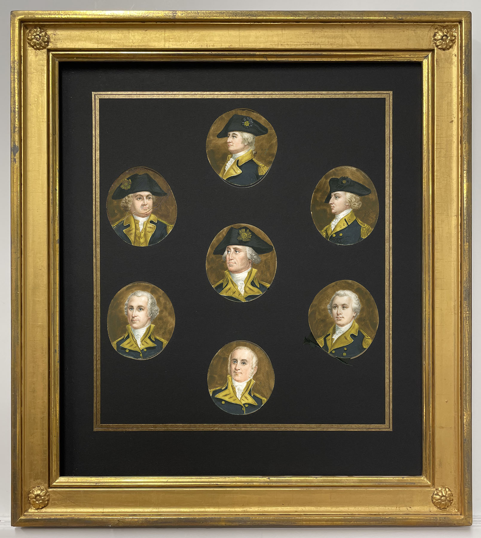 DESCRIPTION: This set of watercolor miniatures on whale bone features finely rendered portraits of key American Revolutionary War generals, arranged in a clockwise sequence: General Anthony Wayne, General Horatio Gates, General Nathanael Greene, General Morgan Lewis, General Daniel Morgan, and General Israel Putnam, with General George Washington at the center. The portraits are executed with remarkable precision and sensitivity, evoking the neoclassical dignity associated with John Trumbull’s iconic depictions of the founding generation. <br><br> Though born of deception, these miniatures remain both skillful and historically evocative. Created by Edouard Frossard late in his career, they were designed to imitate the style and substance of Trumbull’s work and were painted on whale bone to enhance their period appearance. Frossard intended these works to pass as authentic Trumbull originals or early patriotic tributes, appealing to the growing market for Revolutionary-era relics. While ultimately exposed as forgeries, they stand as enduring examples of Frossard’s technical virtuosity and his deep familiarity with the visual language of American patriotism. <br><br> Despite their spurious origins, the artistic merit of these miniatures commands attention. Frossard’s careful composition, mastery of miniature portraiture, and sensitivity to period likenesses give the set a compelling presence. Even as they fail to convince as genuine Trumbulls, they succeed as testaments to the enduring appeal of Revolutionary iconography and the persuasive power of skilled craftsmanship.