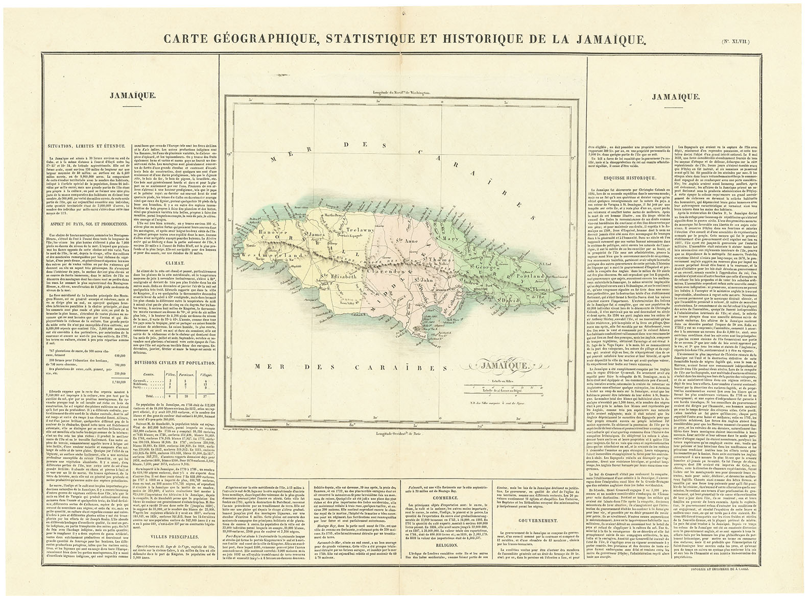 DESCRIPTION: This map, "Carte Géographique, Statistique et Historique de la Jamaïque" by Jean Alexandre Buchon, published in 1825, is a richly detailed and visually striking map of Jamaica that offers both geographic precision and historical insight. Issued as part of the French edition of Carey & Lea’s celebrated atlas, A Complete Historical, Chronological, and Geographical American Atlas, this map reflects early 19th-century European interest in the Caribbean and the broader Americas. Buchon’s work is particularly prized for its elegant layout, combining cartography with in-depth commentary, and was part of a series that presented updated political and geographic knowledge to a rapidly modernizing world. The map itself is hand-colored to show the island’s parishes, and is filled with fine detail—rivers, roads, towns, ports, and natural features are all clearly marked. Surrounding the map is a panel of French text describing the island’s geography, climate, trade, and the key waterways that shaped its development. Both decorative and informative, this map serves not only as a valuable historical document but as an attractive piece for collectors interested in colonial-era cartography and the visual storytelling of one of the Caribbean’s most strategically significant islands.