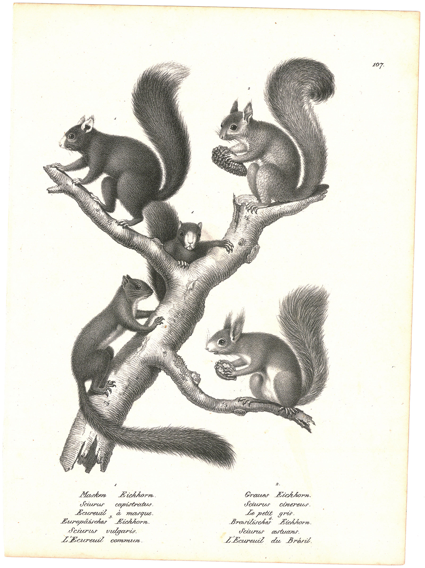 DESCRIPTION: This uncolored version of Karl Joseph Brodtmann’s "Different Kinds of Squirrels" is an example of early 19th-century scientific illustration. Originally part of his Naturgeschichte und Abbildungen der Säugethiere (Natural History and Illustrations of Mammals), this lithograph was initially produced in black and white, with some editions later hand-colored.