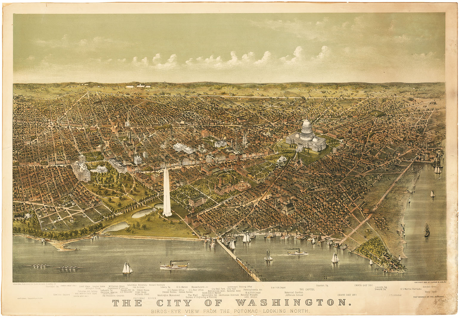 DESCRIPTION: A spectacular view of Washington, D.C. from the harbor looking at the National Mall with the Washington Monument, Capitol, and the White House. The original Smithsonian Institution building is seen on the mall and in the foreground left are two rowing shells, and other traffic in the harbor. <BR><BR> Below the title 59 locations are identified.