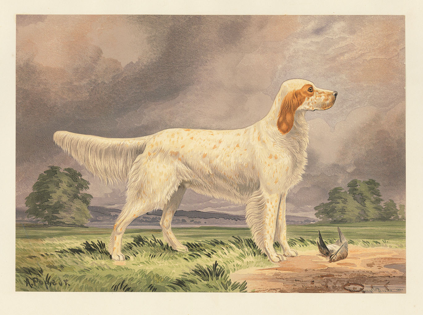 DESCRIPTION: The first Llewellin Setter in America.<br><br> Owned by by the Kentucky Kennel Club, Frankfort, Kentucky. Lofty was bred by R.L.L. Purcell Llewellin Esq., Willesley Hall, Ashby-de-la-Zouch, Leicestershire, England.<br><br> From the series Celebrated Dogs of America.<br><br> “In presenting the Celebrated Dogs of America to the public, it is the design of the Author to give those interested in the subject of portraits of well-known and representative dogs of the various breeds… . The style of the present work is entirely original ... The pictures are painted from life by Alex. Pope, Jr., whose Upland Game Birds and Water Fowl of the United States, and wood carvings of Game Birds, have made him familiar to the sportsmen art lovers of this country ... The Celebrated Dogs of America will be issued monthly, in parts composed of two plates, 16 1/2 by 20, and accompanying letter-press. The series will be completed in ten parts, at $2 per part. The plates will be exact reproductions of the water-color paintings, and will be superior to anything heretofore produced of this nature ... The work will be sold only by subscription..."<br> (prospectus for the series by S.E. Cassino.)<br><br> Alexander Pope Jr. (1849-1924) American sporting artist who specialized in animal and still life paintings. Born in Dorchester, Massachusetts in 1849, he briefly studied sculpture with the prominent artist William Copley. Although primarily lauded as a painter, he continued producing sculptures well into the 1880s and later became a member of the Copley Society of Boston. Two works were published from his paintings, Upland Game Birds and Water Fowl of the United States (1878), and Celebrated Dogs of America (1879).<br><br>