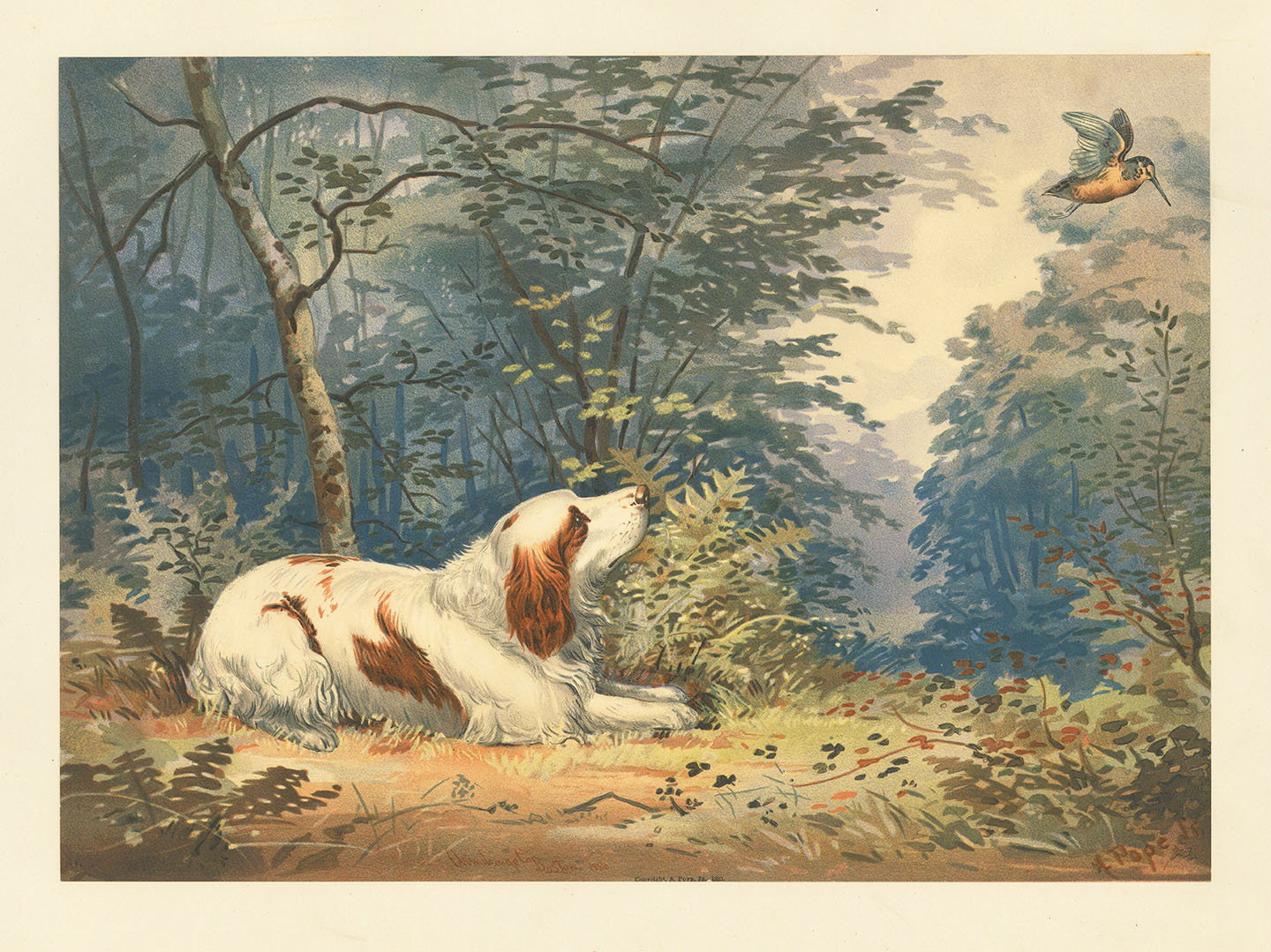 DESCRIPTION: Owned by Mr. Wm. M. Tilrston, New York. Trimbush was bred by William Bailsford, head keeper to the Duck of Westminster, and was imported by Mr. Jonathan Thomas, Jr. of New York.<br><br> From the series Celebrated Dogs of America.<br><br> “In presenting the Celebrated Dogs of America to the public, it is the design of the Author to give those interested in the subject of portraits of well-known and representative dogs of the various breeds… . The style of the present work is entirely original ... The pictures are painted from life by Alex. Pope, Jr., whose Upland Game Birds and Water Fowl of the United States, and wood carvings of Game Birds, have made him familiar to the sportsmen art lovers of this country ... The Celebrated Dogs of America will be issued monthly, in parts composed of two plates, 16 1/2 by 20, and accompanying letter-press. The series will be completed in ten parts, at $2 per part. The plates will be exact reproductions of the water-color paintings, and will be superior to anything heretofore produced of this nature ... The work will be sold only by subscription..."<br> (prospectus for the series by S.E. Cassino.)<br><br> Alexander Pope Jr. (1849-1924) American sporting artist who specialized in animal and still life paintings. Born in Dorchester, Massachusetts in 1849, he briefly studied sculpture with the prominent artist William Copley. Although primarily lauded as a painter, he continued producing sculptures well into the 1880s and later became a member of the Copley Society of Boston. Two works were published from his paintings, Upland Game Birds and Water Fowl of the United States (1878), and Celebrated Dogs of America (1879).